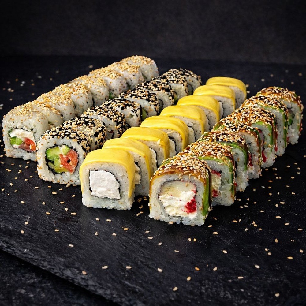 Рол Самурай, Рол Філадельфія з огірком, Рол Невада з грушею, Рол Кампай з креветкою, Рол Сирний в чорному кунжуті